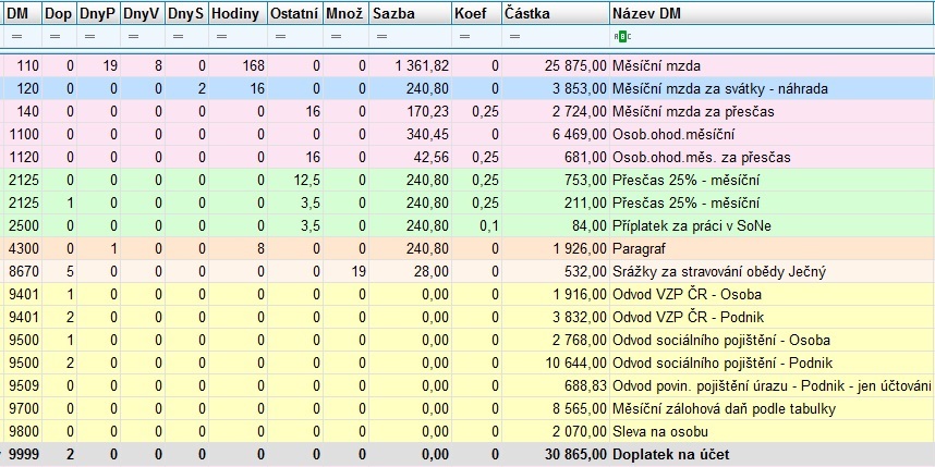 · Barva šedá = poslední zvýrazněný řádek osoby s doplatkem na účet, čistou a hrubou mzdou v údaji „Výpis“