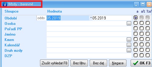 · Po spuštění modulu MZDY se uživateli zobrazí jeden filtr vztahující se k prvnímu výchozímu přehledu MZDY- BAREVNĚ. Po vyplnění filtru se zobrazí na horní liště kromě výchozího přehledu i přehledy další, které by měly usnadnit uživateli práci se mzdovými daty. Pokud uživatel na některý z těchto přehledů klikne myší, zobrazí se mu filtr vybraného přehledu a po vyplnění filtru se požadovaný přehled zobrazí.