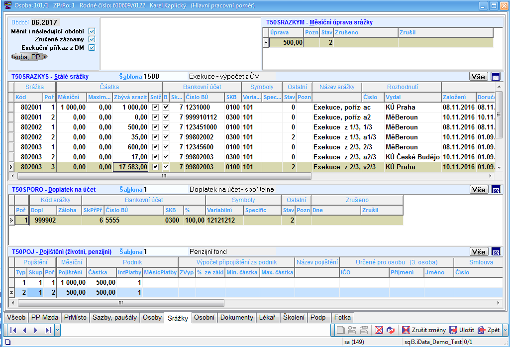 způsobem: 1. Měsíční - pevně stanovená měsíční srážka, např. nájemné, spoření,… 2. Maximální = maximální požadovaná měsíční částka ke sražení, např. výživné 3. Zbývá srazit = celková částka srážky (exekuce), hlídá, aby poslední srážka nebyla vyšší než zbývá srazit 4. Sniž – zaškrtnutím se každý měsíc snižuje dlužná částka (využíváno hlavně u exekucí, insolvencí, dlužného výživného) 2) Bankovní účet 1. BU · zaškrtnutím se platba provede bezhotovostně na bankovní účet, povinnost zaškrtnutí je určena v C5401 ve sloupci „vždy vyplnit BU“ · nezaškrtnuto – provede srážku, ale nevyhotoví převodní příkaz 2. SkPříkazů –skupina převodních příkazů - C5402– zařadí do požadované skupiny převodních příkazů 3. Číslo BU – číslo účtu, kam se má srážka převést. Jednotlivě ke každé srážce. 4. SKB – kód banky 3) Symboly – vyplní se dle požadavku 1. Variabilní 2. Specifický 3. Konstantní – doplní se od kódu srážky z C5401 4) Ostatní 1. Stav · 0-neaktivní, 2 – platné jen při aktivním PP, 3 – aktivní vždy, 9 – zrušené · Při přechodu na nové období se u srážek a pojištění mění stav 2 na stav 0 v případě, že se jedná o zaměstnance, kterému byl ukončen pracovní poměr. 2. Poznámka – možnost uložit si poznámku, která se zobrazí v prázdném horním okně 5) Název srážky – automaticky se dotáhne název srážky z číselníku C5401 6) Číslo rozhodnutí – opíše se číslo obdrženého soudního rozhodnutí o exekuci nebo insolvenci či dlužném výživném 7) Vydal rozhodnutí – opíše se z rozhodnutí, kdo ho vydal 8) Datum 1. Založení – den vzniku záznamu 2. Doručení · kdy, byl dokument doručen na podnik (i u předchozího zaměstnavatele) · povinnost vyplnění je u SOUDNÍHO NAŘÍZENÍ · má vliv pro určení pořadí uspokojení srážek, u srážek stejného druhu doručených současně, určí procento uspokojení pohledávky v poměru dlužné částky 3. Právní moc od - od · od kdy je platné soudní nařízení (vyčte se z obdrženého dokumentu), po datu doručení do doby nabytí platnosti je možno srážet a částku deponovat pro odeslání po nabytí právní moci · Pokud je datum od 1.9.2015 je povinnost srážet i z DPP 4. Změny – datum změny záznamu 9) Zrušeno 1. Dne – datum zrušení záznamu 2. Zrušil – jméno obsluhy, která zrušila záznam ·
