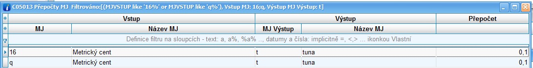 · řádek pro přepočet metrických centů na tuny (Vstup je MJ u položky a v řádku, Výstup je MJ do hlášení)