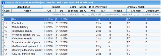 celního sazebníku pro hlášení DPHEVD).