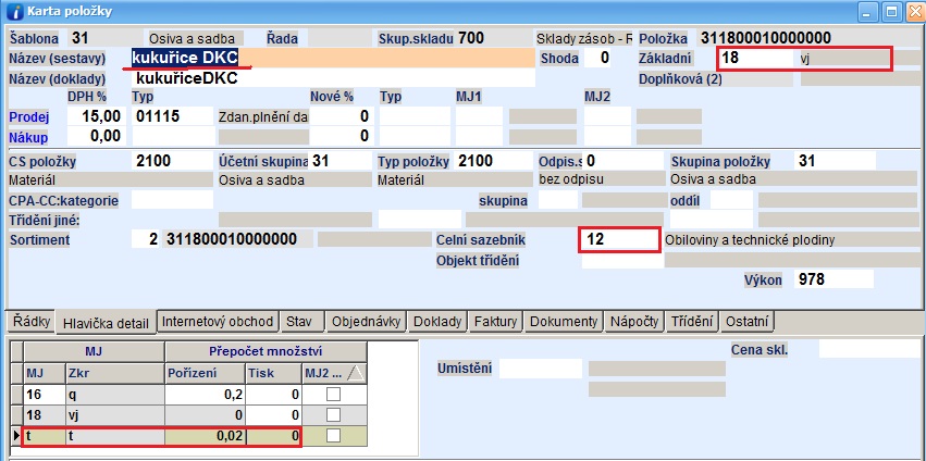 - v řádku se pořizuje jakákoliv skladová položka, která má nastavenou hodnotu celního sazebníku 12