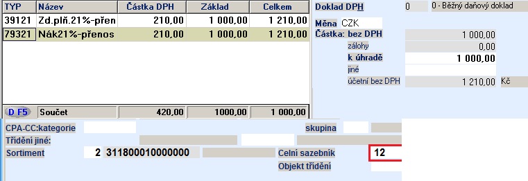 · Při zápisu došlých faktur se položka 4, 5, 12 nebo 13 (s vyplněnou hodnotou celního sazebníku) doplní do automaticky generovaného řádku odvozením od údaje Doklad DPH (viz. C0724)