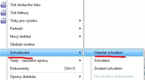 · Ke schválení se doklad odešle na menu přes pravé tlačítko