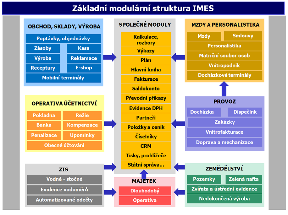 Informační systém IMES pokrývá potřeby firem všech velikostí a obsahuje specializovaná oborová řešení pro oblasti stavebnictví, dopravy, zemědělství, vodárenství a obchodu. Nabízí bohatou nabídku modulů, možnost libovolných zakázkových úprav a dokonalou přizpůsobivost systému všem firemním procesům.