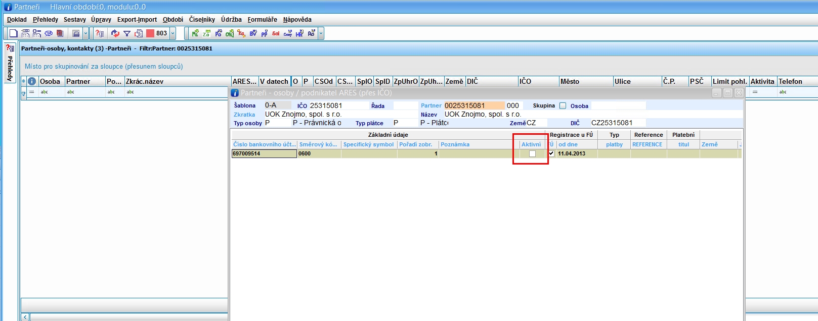 | pole aktivní v c0244 uživatelé se ptají proč ted založíli nového partnera se u bankovního učtu nepřiřadí zatržítko aktivní? Nenabízí se při pořízení došlé faktury pak. |